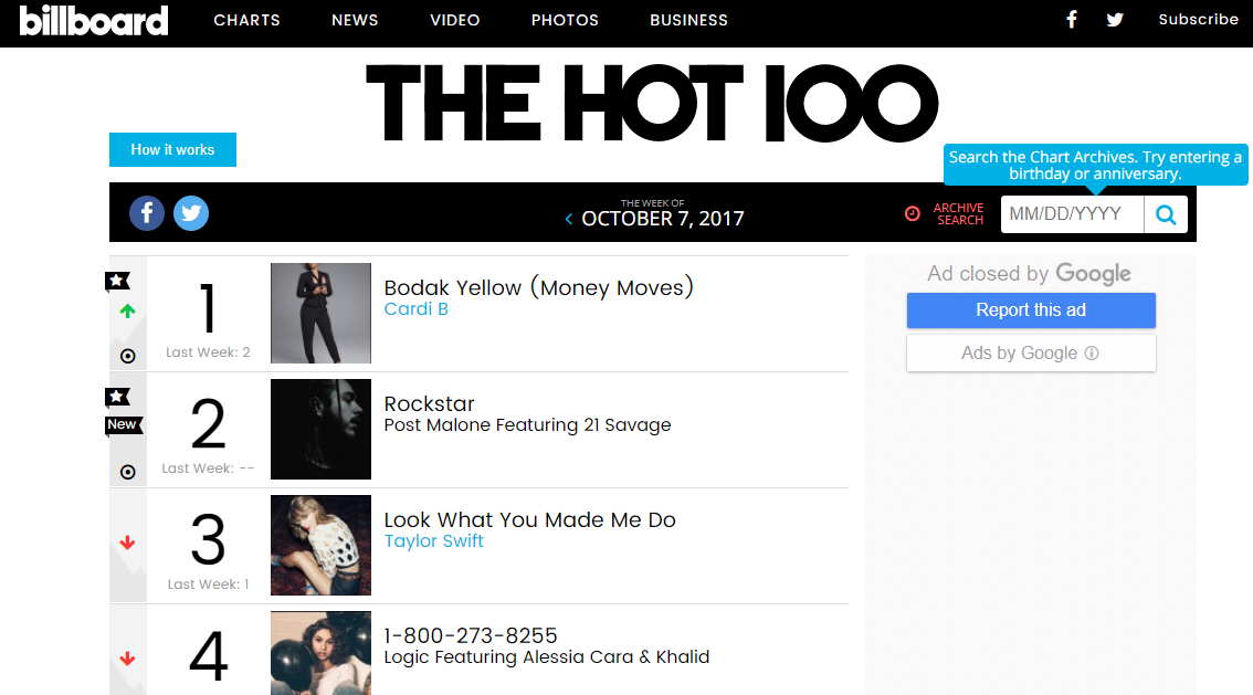 Billboard Hot 100. Foto: Reprodução/Site Billboard